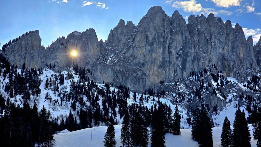 puis le lever d’une lune presque pleine, face aux Gastlosen, immobiles et majestueuses.En raquettes jusqu’au Chalet du Soldat,